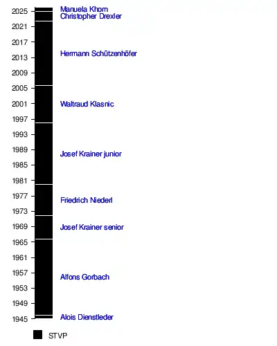 2022 folgte Christopher Drexler Schützenhöfer als Landeshauptmann und Landesparteiobmann nach.[8] Drexler wurde im September 2022 am Landesparteitag mit 98 Prozent der Stimmen zum Landesparteiobmann gewählt, Stellvertreter wurden Viktoria Brandner, Andreas Herz, Karlheinz Kornhäusl, Marcus Martschitsch, Helene Silberschneider und Barbara Walch.[9]