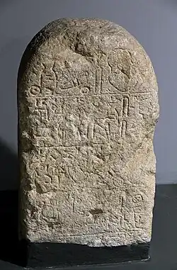 Die Stele ist aus Kalkstein und oben abgerundet. die Höhe beträgt 0,74, die Breite 0,43 und die Tiefe 0,23 Meter. Die eingravierte, vierzeilige Inschrift ist teilweise schlecht erhalten. Der Text beginnt linksläufig auf der Vorderseite (A) rechts oben, verläuft boustrophedon bis zum unteren rechten Ende der Seite, wo er abbricht. Es scheint ein Element zu fehlen, vielleicht eine Basis, das weiter beschrieben war. Danach setzt sich die Inschrift in gleicher Weise auf der linken Seite (B) fort, wo sie wiederum am Ende abbricht.