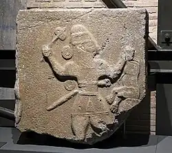 Die Stele ist aus Basalt gefertigt und hat erhaltene Maße von 1,08 Metern in der Höhe und 1,03 Metern in der Breite. Die Seiten und der obere Abschluss sind rechtwinklig begradigt, der Hintergrund sorgfältig geglättet. Ein unterer Teil ist abgebrochen. Dargestellt ist ein bärtiger Held mit einem konischen Helm. Er ist mit einem kurzen Rock bekleidet, der von einem breiten Gürtel mit herabhängender Quaste gehalten wird. Sein Haar hängt in zwei Zöpfen auf dem Rücken herab, von denen einer über und einer unter dem erhobenen rechten Arm aufgerollt ist. An der Hüfte trägt er ein Schwert. Die rechte, nach hinten hochgehaltene Hand hält eine Waffe, möglicherweise eine Art Keule oder eine Streitaxt. Die Linke hält vor dem Körper ein erbeutetes Tier am Schwanz hoch, vermutlich einen Löwen. Die Figur ist in relativ flachem Relief ausgearbeitet, Einzelheiten wie Gesichtszüge und der rechteckige Bart sind durch eingeritzte Linien angedeutet. Helm, Stirn und Nase bilden eine Linie, die Hüften sind breit und die Schultern hoch dargestellt. Der deutsche Vorderasiatische Archäologe Winfried Orthmann, der das Werk 1971 in seinen Untersuchungen zur späthethitischen Kunst beschrieb, ordnet es nach diesen Gesichtspunkten in die Gruppe Zincirli 1 ein und datiert es damit in die Periode Späthethitisch I/II ein, also etwa ins 10. Jahrhundert v. Chr.