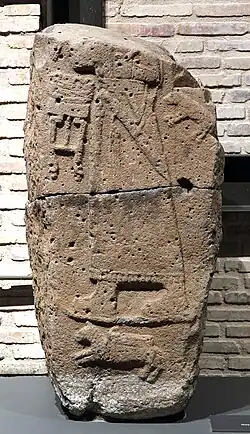 Das Monument ist aus Basalt gefertigt, es hat eine erhaltene Höhe von 1,19 Metern, eine Breite von 0,56 Metern und eine Tiefe von 0,32 Metern. Das obere Drittel ist verloren. Dargestellt ist in flachem Relief ein nach links gewandter, stehender Mann. Er trägt Sandalen und ein bis zu den Knöcheln reichendes, an der Hüfte gegürtetes Obergewand mit einer Borte am unteren Saum. Darüber ist ein Schwertgehänge erkennbar, an dem von Knauf und Scheide Quasten herabhängen. Mit der linken Hand hält er einen über der Schulter hängenden Bogen. Der rechte Arm ist erhoben, am linken oberen Bruchrand sind noch Reste von Gegenständen zu erkennen, die er in der Hand hält. Bonatz erkennt darin gefiederte Pfeilschäfte. Unterhalb der Füße ist ein laufendes Tier, vermutlich Pferd oder Esel, mit einer Last auf dem Rücken abgebildet. Hinter dem Rücken der Gestalt findet sich ein weiterer Vierbeiner, möglicherweise ein Hund. Vor dem Mann steht etwa auf Bauchhöhe ein kleiner Tisch, auf dem mehrere Brotfladen und kringelförmige Gebäckstücke liegen.
