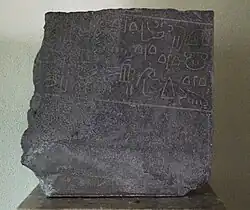 Der Stein aus grauem Basalt hat einen etwa dreieckigen Querschnitt. Durch die zwei winklig zueinander liegenden Flächen auf der Rückseite und eine dazwischen gezogene vertikale Mittellinie wird vermutet, dass etwas mehr als die untere Hälfte der ursprünglichen Stele erhalten ist. Das Fragment hat eine Höhe von 43 Zentimetern und eine Breite von 44 Zentimetern. Die maximale Stärke beträgt 20 Zentimeter. Auf der gut erhaltenen Vorderseite ist in der oberen Hälfte der Rest einer 20 Zentimeter hohen eingravierten Hieroglypheninschrift zu erkennen.