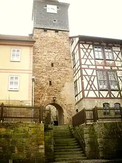 - Der Torturm war wahrscheinlich ein Turm der abgegangenen Burg. Sein Obergeschoss ist aus Holz und ist durch eine welsche Haube abgedeckt. Kirch- und Torturm, die beide denkmalgeschützt sind, nennt man Wächter und Hüter.