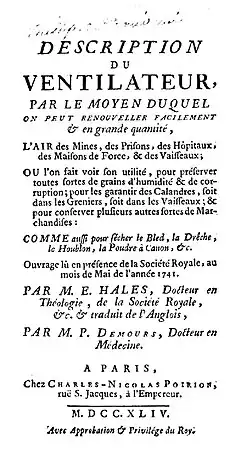 - An Account of a Useful Discovery to Distill double the usual quantity of Sea-water, by Blowing Showers of Air up through the Distilling Liquor … and an Account of the Benefit of Ventilators. London 1756