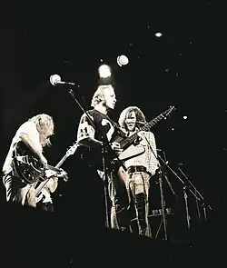 Stephen Stills mit David Crosby (links) und Graham Nash (rechts) bei einem CSNY-Konzert im August 1974