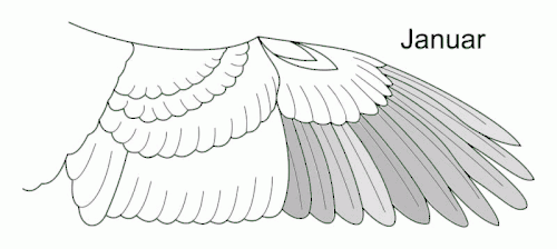 Bei Jungvögeln gibt es neben der Mauser vom Dunen- ins Jugendkleid eine weitere Vollmauser ins erste Winterkleid. Diese beginnt im späten Juli mit den Schulter-, Mantel- und Rückenfedern, von denen im August durchschnittlich 50 bis 75 % ersetzt sind. Damit gibt es auf der Oberseite im frühen Herbstzug meist zwei Federgenerationen, wenngleich bis Mitte September noch vereinzelt Individuen im ungemauserten Jugendkleid anzutreffen sind. Die Mauser setzt sich von August bis September mit dem Kopf- und restlichen Körpergefieder fort, wobei auch die Schirmfedern und ein Teil der Flügeldecken gemausert wird, sodass das erste Winterkleid meist ab September oder Oktober getragen wird. Anschließend werden noch von Ende September bis Dezember die Schwung- und Steuerfedern jeweils von innen nach außen ersetzt. Bei den Handschwingen finden im darauffolgenden Frühjahr gleichzeitig zwei verschobene Mauserserien statt, die von April bis Mai bei der siebten bis achten bzw. bei der dritten bis fünften Handschwinge abgebrochen werden. Manchmal beginnt ab Mai eine dritte und im Juli eine vierte Mauserserie der Handschwingen, die zum Beginn des Herbstzugs ungefähr in der Mitte beziehungsweise bei den inneren Federn abgebrochen werden.[1]