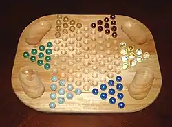 Die Spielfiguren werden zu Beginn des Spiels in den farbigen Zacken aufgebaut, wobei die Aufstellung abhängig von der Anzahl der Mitspieler geschieht. Bei zwei Mitspielern werden zwei gegenüberliegende Startfelder mit je 15 Spielfiguren aufgebaut. Bei drei Mitspielern bekommt jeder Mitspieler je ein Startfeld mit 15 Spielfiguren, die gegenüberliegenden Felder gleicher Farbe bleiben frei.[5] Bei vier oder sechs Mitspielern bekommt jeder Spieler ein Startfeld gegenüber jeweils einem Gegner, stellt allerdings nur jeweils 10 Spielfiguren auf, die innerste Reihe bleibt frei.[1] Alternativ können beim Spiel zu sechst auch 14 Spielfiguren genutzt werden, allerdings kann dann kaum noch gesprungen werden.[6] Bei fünf Spielern ergibt sich ein asymmetrisches Spiel, bei dem ein Mitspieler einem freien Feld gegenübersteht während alle anderen jeweils einer gegnerischen Farbe gegenüberstehen.