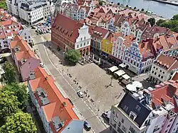 • Der Altstadt direkt gegenüber befindet sich die Insel Lastadie (Łasztownia), die über die Most Długi (übersetzt „Lange Brücke“, früher Hansabrücke) erreicht wird. Der Stadtteil Łasztownia grenzt unmittelbar an das Gebiet des Seehafens. Die Insel wird ohne Anbindung an ihr Straßennetz von der Schnellstraße Trasa Piotra Zaremby überquert, die, nördlich der Altstadt als Trasa Zamkowa (Schloss-Trasse) beginnend, Ost- und Westoder überquert.