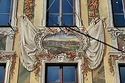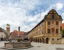 Das Gebäude an der Nordseite des Marktplatzes besitzt einen Laubengang mit Rundbögen und ist überwiegend ockerfarbig bemalt. In der Mitte der Vorderfront ist auf Höhe des ersten Stockes eine Stadtansicht vom ausgehenden 19. Jahrhundert zu sehen, ansonsten herrschen barocke Muster mit Muscheln und Rocaillen vor. Die vielen Fenster sind im Sommer mit rotblühenden Geranien geschmückt. Die Rückseite ist nur vom Garten des ehemaligen Augustinerklosters aus zu sehen und besitzt keine Fenster. Die Stirnseiten sind mit barocken geschwungenen Giebeln verziert; Fenster sind nur aufgemalt. Der Eingang des Steuerhauses ist der ehemalige Münzturm.