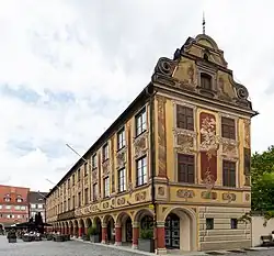 Bei der Errichtung war das Gebäude einstöckig und hatte 20 Rippenbögen. 1522/63 wurden drei Bögen an der rechten Seite des Hauses abgebrochen, um dem Rathaus einen würdigeren Rahmen zu geben. 1708 wurde es um ein Stockwerk erhöht. Zu seiner Entstehungszeit war es ein profaner unverputzter Ziegelbau. Die heutige neubarocke Bemalung konnte 1909 aufgrund des Vermächtnisses der Bürgermeisterswitwe Rosa von Zoller vollendet[1] und mit einer gemalten neubarocken Stadtansicht in der Mitte des Gebäudes versehen werden. Es verbindet den Rathausvorplatz mit dem westlichen Fischmarkt.