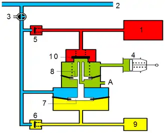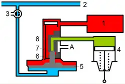- über das Rückschlagventil 6 in den Steuerbehälter 9 und in den Raum (gelb) unter dem Steuerkolben 7.