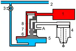 Einlösige Steuerventile arbeiten nach dem Zweidruckprinzip. An der Steuerung der Druckluftbremse sind der Luftdruck in der Hauptluftleitung (blau) und im Hilfsluftbehälter (rot) beteiligt.