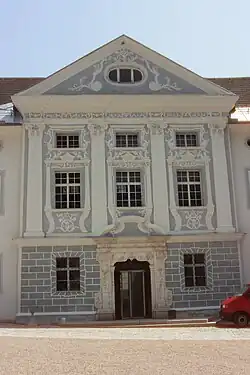 Der Nordflügel besitzt einen Durchgang zur Kirche. Der Durchgang hat hofseitig ein korbbogiges Steinportal vom Anfang des 19. Jahrhunderts. Die Durchfahrt hat ein Platzlgewölbe zwischen Gurten über gefasten Halbpfeilern. Die Innenräume stammen vom Ende des 18. Jahrhunderts.[3]