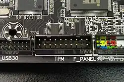 Auch Zusatzmodule werden oft über eine definierte Stiftleiste mit der Hauptplatine verbunden, wie etwa ein (dediziertes) Trusted Platform Module (TPM).
