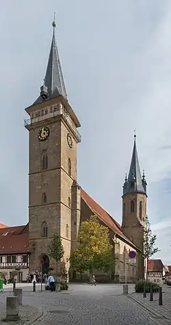 Die evangelische Stiftskirche St. Peter und Paul ist das weithin sichtbare Wahrzeichen der Stadt Öhringen. Die spätgotische, dreischiffige Hallenkirche wurde von 1454 bis 1497 errichtet.