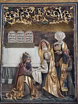 Die Reliefs in den Seitenflügeln zeigen vier Szenen aus der Weihnachtsgeschichte. Chronologisch beginnt die Geschichte links oben mit der Verkündigung der Geburt Jesu an Maria. Es folgt rechts oben das Weihnachtsgeschehen selbst, entsprechend der nach der Vision der Birgitta von Schweden üblichen Ikonographie als Verehrung des nackt auf dem Boden liegenden Jesuskindes durch seine Eltern im Stall von Bethlehem. Unten links ist die Anbetung des Jesuskindes durch die Heiligen Drei Könige dargestellt. Dabei erscheinen die drei Könige als Vertreter der drei damals bekannten Kontinente. Unten rechts ist die Darstellung des Kindes im Tempel abgebildet. Die hebräischen Buchstaben in der im Jerusalemer Tempel lokalisierten Szene ergeben keinen Sinn. Simeon, der vor dem Jesuskind kniet, ist durch die quersitzende Mitra als jüdischer Priester erkennbar. Hinter Maria, die hier als verheiratete Frau mit Schleier erscheint, und Joseph stehen die Prophetin Hanna und eine Frau mit einem Korb, in dem die beiden Tauben sitzen, die nach Lev 12,8 als Opfer für die Reinigung der Mutter nach der Geburt vorgeschrieben waren.