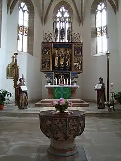 Vor der Reformation soll es insgesamt sechs Altäre gegeben haben, von denen der Hauptaltar Maria geweiht war und die Nebenaltäre dem Heiligen Kreuz, den Heiligen Nikolaus und Hieronymus, der heiligen Anna sowie allen Heiligen.[32] Von einem 1446 geweihten Altar hat sich die Weiheinschrift erhalten, nach der er dem Andenken der Heiligen Johannes des Täufers, Bartholomäus, Kunigunde, Hieronymus und Ottilie gewidmet war.[17] Ein weiterer, unvollständig erhaltener Altar von etwa 1490, der sich 1886 im Museum des Vereins für Chemnitzer Geschichte befand, dessen Bestände 1928 dem Schloßbergmuseum Chemnitz überlassen wurden, zeigte im Mittelschrein geschnitzte Figuren von Anna Selbdritt, Maria und Ulrich von Augsburg.[33]