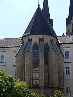 Abt Heinrich II. ließ die romanische Kirche um einen gotischen, in fünf Seiten des Zehnecks schließenden Mönchschor erweitern und 1286 durch Konrad von Himberg, Bischof von Chiemsee, weihen. Abt Wilhelm von Reisberg begann gegen Ende des 14. Jahrhunderts den gotischen Ausbau der Westtürme, die aber erst unter seinem Nachfolger Hartnid Gleusser vollendet wurden. Im 15. Jahrhundert wurde das bisher flachgedeckte Langhaus durch Mitglieder der Admonter Bauhütte eingewölbt und der Kirchenraum liturgisch neu ausgestattet.