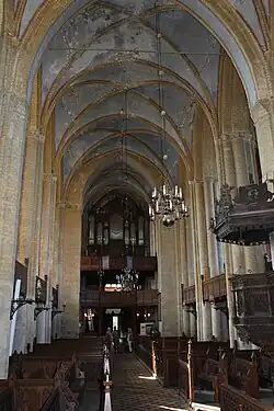 Haupt- und Nebenschiffe werden von Kreuzrippengewölben und das Chorpolygon von einem Sterngewölbe überspannt. Im westlichen Bereich der Seitenschiffe befinden sich hölzerne Emporen. Die Pfeiler haben eine ungewöhnliche Form mit sechs Halbrundvorlagen über einem gerundeten Pfeilerkern. Die Kapitelle sind figürlich gestaltet. Die westlichen Pfeiler sind besonders kräftig mit querrechteckigem Kern und sollten einen geplanten Westturm tragen. Den Ostteil des Mittelschiffes bestimmen die zwei Joche des Vorgängerbaues mit ihren Wandvorlagen, die aus der Hälfte eines Achtecks gebildet und mit einem Trapezkapitell gekrönt werden. Begleitet werden sie von Runddiensten mit Kelchkapitellen. In den Seitenschiffen zieren Knospenkapitelle die Pfeiler.