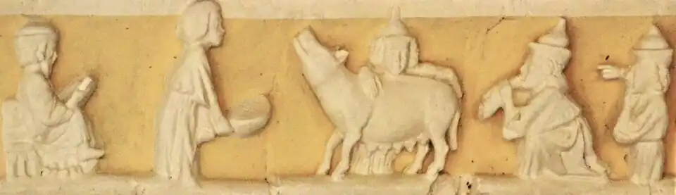 - kniende Person, ein Objekt zum Mund führend. (Vermutlich isst sie die Exkremente der Sau)