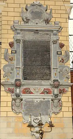 Im Chorbereich auf der Südseite an einem Pfeiler hängt das zweite Renaissance-Epitaph, welches der Pastor Andreas Cracovius (Krakow) seiner im Jahre 1597 jung verstorbenen Gattin Katharina Schröder und ihrem ebenfalls bei der Geburt verstorbenen Kind setzen ließ.[7][8]