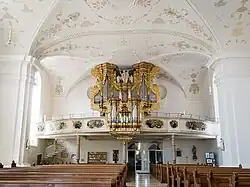 Der Innenraum des Langhauses ist mit einem Kraggewölbe überspannt. Zur Kirchenausstattung gehört ein Hochaltar, dessen Altarretabel 1767 Johann Pfunner gemalt hat. Die Orgel mit 37 Registern wurde 2016/17 von Tilman Trefz in das Gehäuse der ersten Orgel von Johann Christoph Albrecht (1722) gebaut.[1][2]