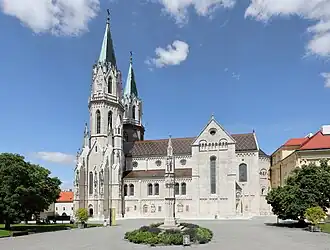 - Der barock-gotische Nordturm des 17. Jahrhunderts wurde um ein neugotisches Turmgeschoß mit Wimperg-Bekrönung und gotischen Spitzbogen-Lanzettfenstern erweitert und mit einer Turmhelm-Verdachung komplettiert. Der Südturm wurde aufgrund von Statikproblemen abgetragen und neu in Anpassung an die Turmgeschoße des Nordturmes errichtet. Dahingegen zeigt der neu errichtete Mittelgiebel der Westfassade romanische Rundbogenfriese und Rundbogenfensterformen.