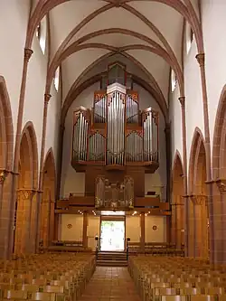 Im Innern entspricht die Raumaufteilung der Kirche des ersten Bauabschnitts. Vor 1851 war das Bauwerk nur bis zum zweiten Joch von Osten eingewölbt, das Mittelschiff nur bis zum ersten Joch. Der nach Westen flachgedeckte Raum wurde 1851 konsequent entsprechend dem ersten gotischen Bauabschnitt vereinheitlicht und eingewölbt. Im Langhaus sind spitzbogige Arkaden mit abgetreppten und abgefasten Bögen zu finden. Die Hochschiffwand ist ungegliedert und zeigt nur sehr kleine, hoch ansetzende Fensteröffnungen. Der Aufbau der Stützen entspricht fast noch den romanischen Formen mit weiten Bogenstellungen und einem quadratischen Pfeilerkern mit vorgelegten Halbsäulen. Zum Gewölbe hin steigen schlanke, vermutlich mittelalterliche Dienste auf. Die Kreuzrippengewölbe in den Seitenschiffen zeigen waagerechte, im Mittelschiff ansteigende Scheitel. Die Rippen sind abgeschrägt. Das Motiv der tellerförmigen, auskragenden Basen, die mit kleinen Konsolen mit dem Sockel verbunden sind, ist von der Bauhütte des Straßburger Münsters herzuleiten. Die Kapitelle in Kelchform sind mit Knospen- und Blattwerk geschmückt, nur diejenigen im Chor sind noch mittelalterlich.