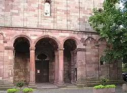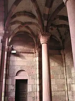 Die ältesten Bauteile der Kirche aus dem Ende des 11. Jahrhunderts (1080–1100) sind die Außenmauern der Seitenschiffe, die außen noch vereinzelt Skulpturenschmuck des Vorgängerbaus sowie eine reliefgeschmückte (u. a. Davids Kampf mit dem Löwen?) Tür auf der Südseite aufweisen.