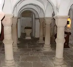 Aus dieser Zeit ist auch durch Grabungen eine erste Kirche mit Krypta im Westteil der heutigen Kirche nachgewiesen. Um 1025 wurde die heute noch erhaltene Säulenkrypta angefügt.