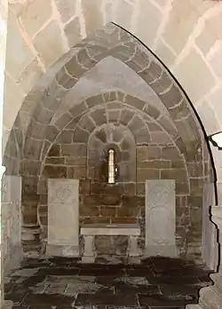 Der schwere steinerne Altartisch in der Turmkrypta stand ursprünglich oben im Turmchor.