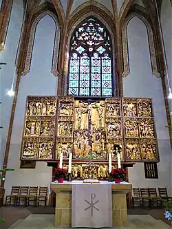 Schmuckstück der Kirche ist der Schnitzaltar aus dem Jahre 1501. Der dreiteilige Flügelaltar wird dem Braunschweiger Madonnenmeister zugerechnet,[2] und zeigt Szenen aus dem Leben Johannes des Täufers (linke Seite), der Kreuzigung nach der Passionsgeschichte des Lukasevangeliums (Mittelteil) und aus dem Leben Jesu. Die beschädigten Rückseiten der Seitenflügel zeigen Tafelmalereien der Passion Christi und Darstellungen, die sich auf das gewaltsame Ende von Johannes dem Täufer beziehen. Der Unterbau des Altars, die Predella, zeigt acht weibliche Heilige und in der Mitte eine Krönung Marias. Zwei weitere ursprüngliche Flügel sind nicht mehr erhalten. In der Sakristei befindet sich ein weiterer, kleinerer Altar aus dem 18. Jahrhundert, der Jesus auf dem Ölberg zeigt.