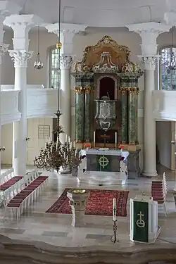 Den Abschluss des Chorbereichs bildet der 1756 aufgebaute hölzerne Kanzelaltar. Die ursprünglichen Pläne des ersten Baumeisters von Blum sahen vor, die Kanzel weit vor dem Altar in der Nähe der Stufen zum Chor aufzustellen. Sein Nachfolger Grützmann änderte den Entwurf und verlegte die Kanzel an die Altarwand, auch um Platz für den Zugang zur nachträglich geplanten Begräbniskapelle zu schaffen. Die korinthischen und mit goldenen Kapitellen geschmückten Säulen links und rechts vom Altar sind übrigens aus Holz gefertigt und wurden mit einer täuschend echt aussehenden Marmornachbildung bemalt.