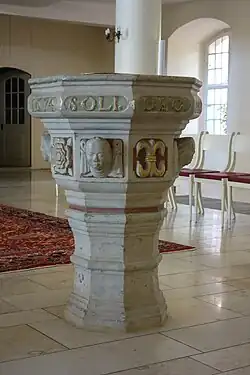 Der heute noch genutzte Taufstein war ein Geschenk der Domina Hedwig Maria von Oberg. Er wurde am 13. November 1674 aufgestellt und war ein Werk des Steinmetzen Ulrich Wendt. Der achtseitige Taufstein hat einen Durchmesser von 0,75 m und ist 1,1 m hoch. Auf dem Rand des Taufbeckens sind der Name der Stifterin und das Stiftungsjahr 1674 eingemeißelt. Nach dem Willen der Stifterin war der Taufstein über ihrem Grab aufgestellt worden, heute steht er im vorderen Chorbereich über dem zugemauerten Eingang zur Gruft.[4]
