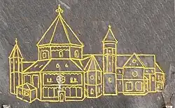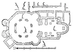 Im Westen beschlossen zwei oktogonale Türme den Bau, dazwischen befand sich als Hauptzugang ein abgetrepptes Portal. Vor dem Portal soll sich nach einigen Quellen ein Paradies befunden haben, dies konnte archäologisch allerdings nicht nachgewiesen werden. An die beiden östlichen Schrägseiten schlossen sich im 5/8-Schluss ebenfalls oktogonale Apsiden an. Die gerade Ostseite beschloss eine halbkreisförmige Apsis, die bis unmittelbar an die Westseite der bereits vorhandenen älteren Kapelle reichte.