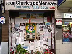 Improvisierte Gedenkstätte für Jean Charles de Menezes an der Stockwell Underground Station, im Dezember 2006