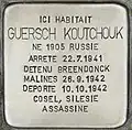 HIER WOHNTE GUERSCH KOUTCHOUK GEBOREN 1905 IN RUSSLAND VERHAFTET 22.7.1941 INTERNIERT IN BREENDONCK MECHELEN 26.9.1942 DEPORTIERT 10.10.1942 COSEL, SCHLESIEN ERMORDET |