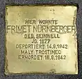 Ernestine Grünberg (geboren am 8. März 1897 in Sereth in der Südbukowina). Sie war die Mutter von Elfriede Grünberg und wurde am 9. Juni 1942 gemeinsam mit ihrer Tochter von ihrem letzten Wiener Wohnort, dem Haus Blumauergasse 22 in der Leopoldstadt, in das Vernichtungslager Maly Trostinez deportiert. Dort ist sie laut Opferdatenbank des DÖW am 15. Juni 1942 ermordet worden. |