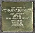 HIER WOHNTE KATHARINA RATHMAYR GEB. LEUTGEB JG. 1880 TRANSPORT 11.10.1940 HARTHEIM 'AKTION T4' ERMORDET |