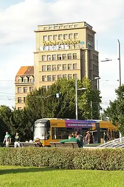Hochhaus am Albertplatz mit dem „Verkehrsbetriebe“-Schriftzug