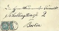 Der Brief aus Stralsund, gerichtet an einen Maurermeister in Berlin, wurde um 1860 abgesandt. Der Briefinhalt ist nicht mehr vorhanden. Das genaue Datum ist unbekannt; die Datierung „um 1860“ folgt der Tatsache, dass die verwendeten Briefmarken ab 1857 verausgabt wurden und der Aufgabestempel ab April 1859, wobei zu dieser Zeit schon eine andere Ausgabe der Briefmarken herausgegeben worden war.[2]