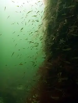 - In Tiefen zwischen zwei und fünf Metern befinden sich Flächen mit Bewuchs von Miesmuscheln, Blasentang (Fucus vesiculosus) sowie Seegraswiesen.