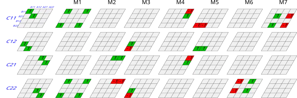 Die linke Spalte repräsentiert eine -Matrizenmultiplikation. Jede andere Spalte repräsentiert eine der Multiplikationen des Strassen-Algorithmus.