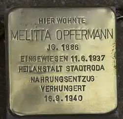 - Am 18. Juni 2015 wurde vor dem Haus Bahnhofstraße 7 (ehemals Hausnummer 5) im Beisein von Vertretern der Stadtverwaltung und des Landkreises sowie einer Enkelin der Betroffenen von Gunter Demnig ein Stolperstein gesetzt, der an die dort zuletzt freiwillig wohnende Melitta Opfermann erinnern soll.
