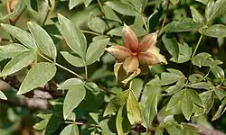 Doppelt dreiteilige Laubblätter und unreife Balgfrüchte