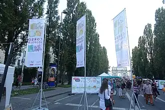 Seit das Streetlife Festival auf der Leopold- und Ludwigstraße gefeiert wurde, fand zugleich am nördlichen Ende der Straße der Corso Leopold statt. Dabei gingen beide Festivals wenige Meter nördlich des Siegestors an der Georgenstraße[6] nahtlos ineinander über.[112] Während beim Streetlife Festival besonders die Umwelt und eine nachhaltige Mobilität im Fokus stand, konzentrierte sich der Corso Leopold auf die Themen Kunst und Kultur.[6] Dem Inhaltsschwerpunkt entsprechend wurde das Streetlife Festival vom Umweltreferat unterstützt, während das städtische Kulturreferat am Corso Leopold mitwirkt.[113] Gemeinsames Thema war die Gestaltung des öffentlichen Raums.[114] Beide Festivals bilden zusammen eine 2,3 Kilometer lange Flaniermeile.[42]