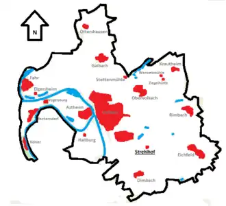 ![]() Lage des Strehlhofes (fett) innerhalb des Volkacher Gemeindegebietes