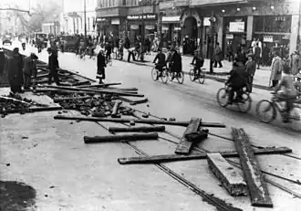 BVG-Streik 1932: Straßenbahnschienen in Berlin-Schöneberg werden blockiert, um von Streikbrechern gefahrene Straßenbahnen aufzuhalten