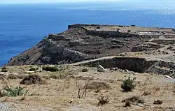 Auf dem unteren Teil des Sattels verbindet eine etwa 80 Zentimeter breite Vormauer (protichisma προτείχησμα) aus großen bearbeiteten Steinen mit der Funktion als Annäherungshindernis die beiden steilen Felshänge des Plateaus. Diese Mauer vom Ende des Spätneolithikums oder dem Beginn des Endneolithikums ist fast über ihre gesamte Länge sichtbar und von einer neuzeitlichen Trockenmauer überbaut. Weiter südlich verläuft die höher gelegene Hauptmauer parallel in einem Abstand von etwa 15 Metern. Die Hauptmauer ist stellenweise bis zu einer Höhe von 2 Metern in sehr gutem Zustand erhalten. Eine ursprüngliche Höhe von 3,5 bis 4 Metern wird vermutet. Die Mauerbreite variiert zwischen 1,6 und 2,5 Meter, sie verstärkt sich bei den Bastionen auf mehr als 5 Meter. Die zweischalige Mauer besteht aus großen Steinen mit Lehmbindemittel und einer Füllung aus kleineren Steinen. Eine besonders starke Bastion sicherte ein Tor am westlichen Mauerende. Zwei weitere ähnliche Bastionen sicherten den zentralen und westlichen Bereich. Die gesamte Befestigungsanlage schützte neben der Hochebene mit der Siedlung auch die weitläufige Landzunge und ermöglichte im Belagerungszustand das Weiden von Tierherden.