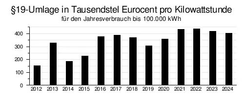 Die den Netzbetreibern daraus entstehenden Kosten werden auf die übrigen Letztverbraucher umgelegt.[8] Diese Umlage nach § 19 Abs. 2 StromNEV wird als Paragraph-19-Umlage oder §19-Umlage bezeichnet. Die Höhe der Umlage ist abhängig vom Stromverbrauch.