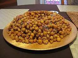 Struffoli ist neben Cicherchiata eine weitere kulinarische Spezialität der Weihnachtszeit, typisch für die Region Kampanien, und besteht aus Dutzenden frittierten Teigbällchen, die in Honig gerollt und mit farbigen Zuckerstreuseln verziert werden. Der Teig aus Mehl, Eiern, Zucker, Fett, Backpulver, Salz und Zitronenschale wird zu Bällchen in der Größe von Murmeln geformt und frittiert. Die in Honig gewälzten Struffoli werden dann kegelförmig auf einer Servierplatte aufgeschichtet.